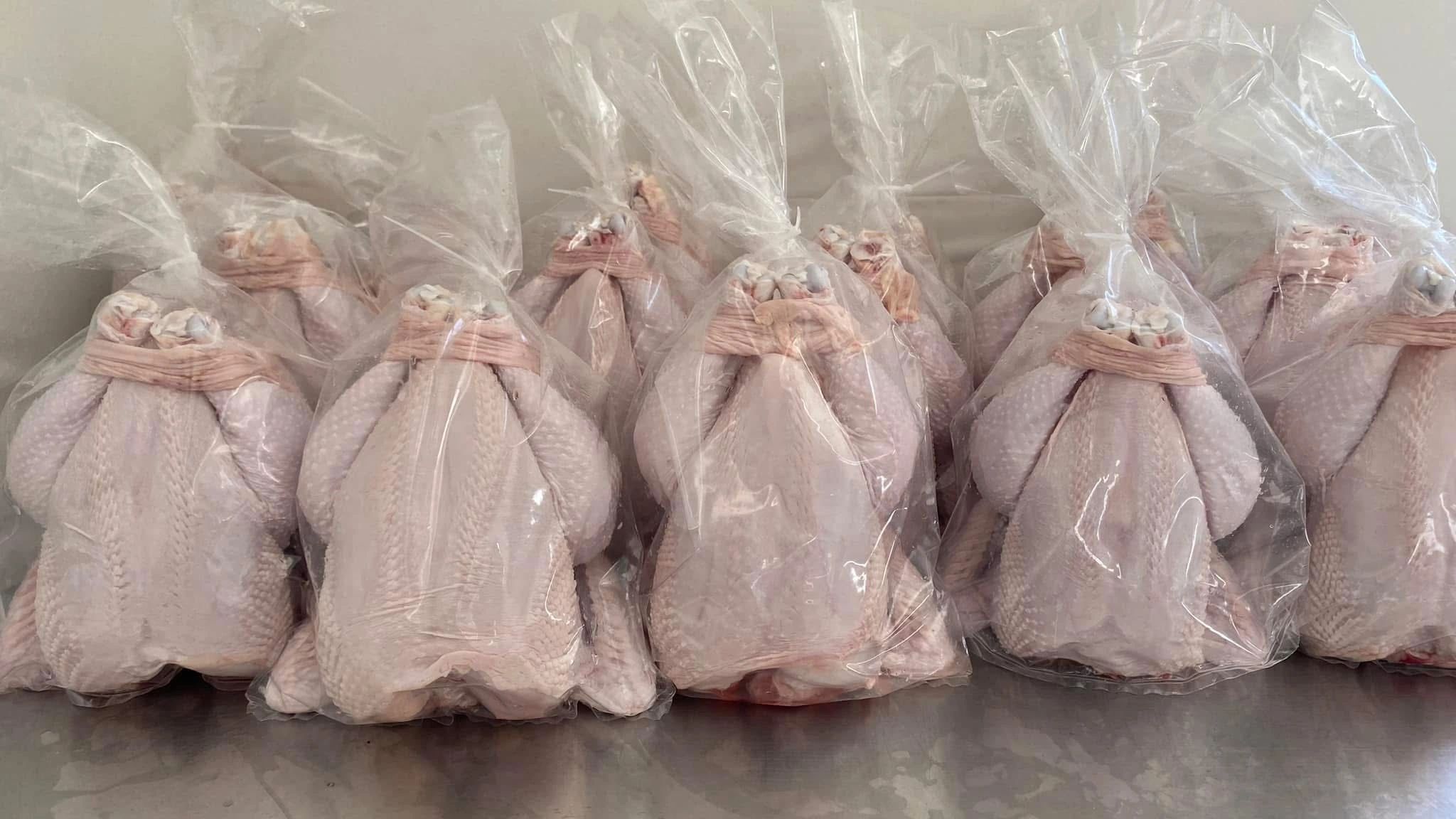 Each bird is shrink wrapped whole, weighed and labeled. Includes neck, heart, liver, gizzard and feet.